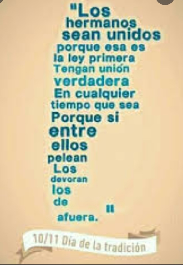 El autor del Martín Fierro, ícono de nuestra literatura nacional, nos convoca poéticamente a la hermandad y unión fraternal. La palabra «Tradición», deriva del latín y significa donación o legado. En ese sentido entendemos que hay quienes dan y quienes heredan… para a su vez, haciendo propia esa herencia, reconociendo y valorando la propia identidad nacional, las raíces, la memoria colectiva del pueblo, volver a entregarla. Así pasado, presente y futuro confluyen en la construcción de un nuevo mundo.