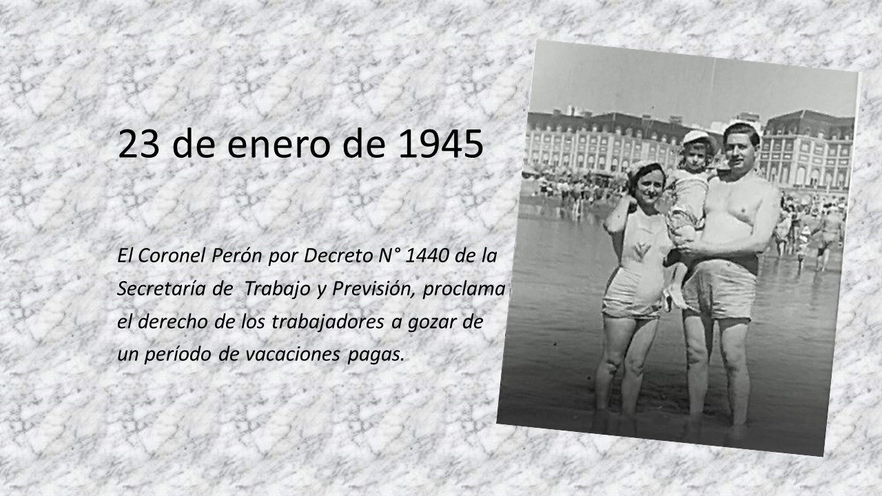 El 23 de enero de 1945, mediante el Decreto N° 1440, la Secretaría de Trabajo y Previsión –con rango ministerial- a cargo del Coronel Juan Domingo Perón proclama el derecho de los trabajadores a gozar de un período de vacaciones pagas.