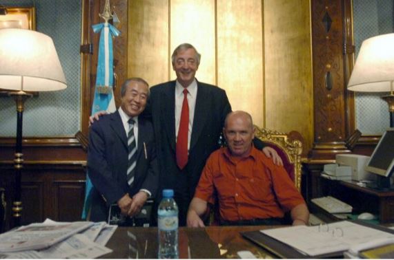 Kirchner lo convocó a una reunión en Casa de Gobierno, lo sentó en el Sillón Presidencial y lo reencontró con el autor de aquella fotografía, Ki Chul Bae. Los tres se tomaron esta foto que quedó para la posteridad. (Página 12, nota aparecida el 15 de junio de 2022 fecha en que se conoció el fallecimiento de Roberto Vassie)