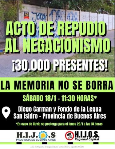 En un clima de creciente preocupación por parte de distintas agrupaciónes políticas y de Derechos Humanos ante expresiones de «negacionismo» y la «desarticulación de las políticas de Memoria, Verdad y Justicia» en Argentina, el próximo sábado 18 de enero a las 11:30 horas se realizará un acto en Diego Carman y Fondo de la Legua, San Isidro.