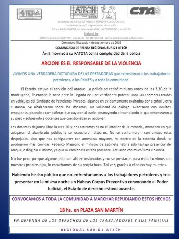 “El Estado estuvo al servicio del ataque. La policía se retiró minutos antes de las 3:30 de la madrugada, liberando la zona ante la llegada de una verdadera patota. Unos 200 hombres traídos en vehículos del sindicato de Petroleros Privados se abalanzaron sobre los docentes sin voluntad de dialogo. Avanzaron con insultos, empujones, pisando compañeras que cayeron al suelo, destruyendo e incendiando lo que encontraron a su paso y golpeando a docentes que cuestionaban su accionar”, explicaron.