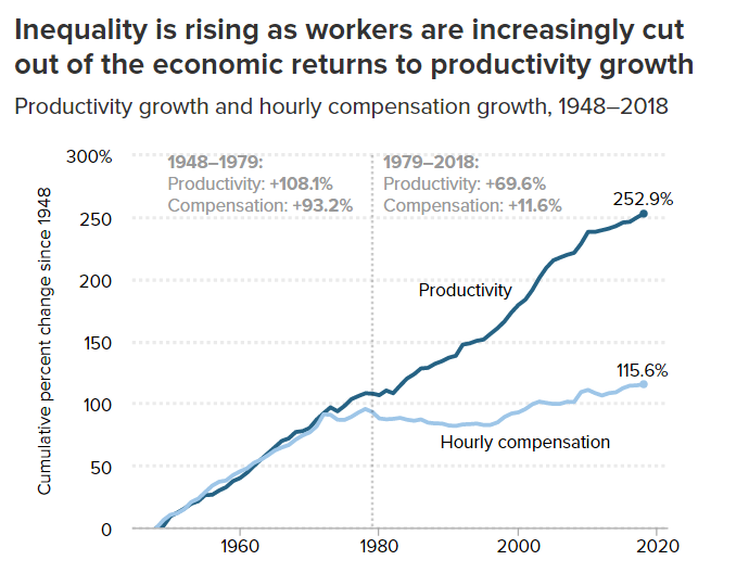 La productividad mide cuánto ingreso total se genera en toda la economía. El salario se define como la compensación promedio de los trabajadores, la referencia apropiada sería el “salario medio de los trabajadores”, aproximadamente el 80% de la fuerza laboral estadounidense. Como muestra la figura, los salarios de estos trabajadores aumentaron junto con la productividad desde 1948 hasta finales de los años setenta. Pero eso no sucedió por casualidad, ocurrió porque se adoptaron políticas específicas con el objetivo intencional de distribuir ampliamente los beneficios del crecimiento entre las clases capitalista y los trabajadores. Cuando se abandonó estos objetivos político intencionales, a finales de los años 1970 y después, los salarios y la productividad divergieron.