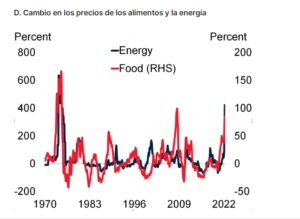 La coyuntura actual se parece a la de los años setenta, pero se ha desmejorado de manera inhumana desde entonces. La economía está saliendo de dos crisis, 2008 y la pandemia de 2020, como lo hizo durante la estanflación (recesión con inflación) de los años setenta, idéntica definición en la actualidad. Pero si bien la inflación se aceleró, ha sido notoriamente menor a la crisis del petróleo de mediados de setenta, como muestra el cuadro, aunque el crecimiento ha sido peor. La energía si tuvo un fuerte aumento como muestra el gráfico, pero a diferencia de los setenta, la eficiencia en su gasto, apoyada en terribles políticas energéticas de austeridad, incrementos de la tasa de interés que congelaron la demanda, llevó a que los efectos fueran menores a las de los años setenta.