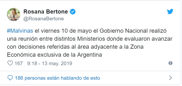 Como legítima Gobernadora de las Islas Malvinas, la defensa de nuestra soberanía y de nuestros recursos es prioridad fundamental. No permitiremos ningún accionar que ponga en peligro nuestros derechos. Las #Malvinas son Argentinas y Fueguinas»