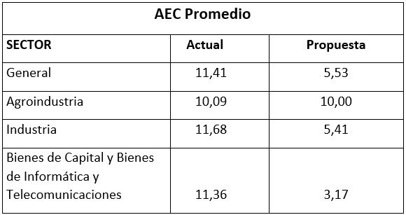 Para darle rigor científico o sustento técnico, Brasil puso en marcha el Grupo Ad Hoc para Examinar la Consistencia y Dispersión del AEC. El 11 de agosto, este grupo presentó una propuesta preliminar de aranceles para cada eslabón del nuevo AEC. Brasil manifestó su voluntad de iniciar la implementación del nuevo AEC el 1° de enero de 2020, y de contar con el total de modificaciones plenamente implementado hacia 2021. El Arancel de Referencia, propuesto en agosto por Brasil para cada uno de los rubros de importación, fue el siguiente:
