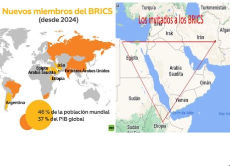 Si alguien tenía dudas acerca de los movimientos geopolíticos de la expansión de los BRICS, su confusión era mayúscula. Sin que nadie conozca el protocolo por el cual estas naciones fueron invitadas de entre 41 solicitantes, formalidad que seguramente será develado en breve, el efecto geopolítico de los invitados no parece una casualidad. El nuevo mapa mostrado más adelante de los miembros para el año 2024, ni en triangulo Egipto–Etiopia–Irán. Es cierto que el 46% de la población y el 37% del PBI han arrasado con cualquier indicador de los países más poderosos, el G7, por ejemplo, aunque es llamativa la iniciativa del Oriente Próximo o Cercano Oriente, o cualquiera de estas expresiones eurocéntricas.