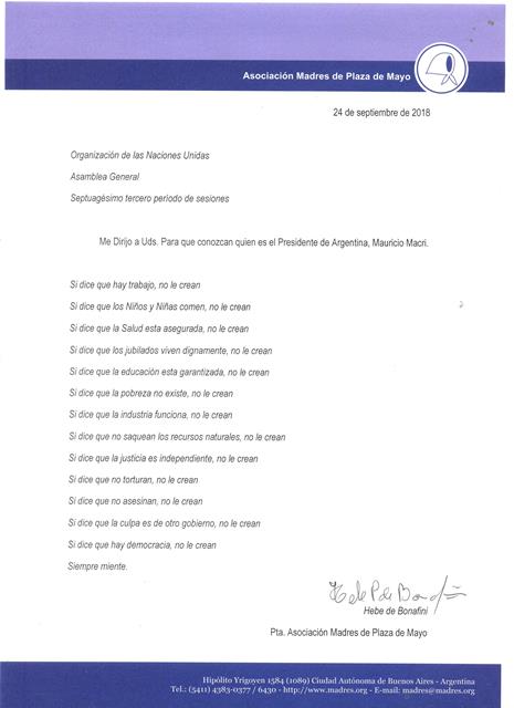 La presidenta de la Asociación Madres de Plaza de Mayo, Hebe de Bonafini, le escribió una carta a la Asamblea General de la Organización de Naciones Unidas (ONU), ante la participación allí de Mauricio Macri.
