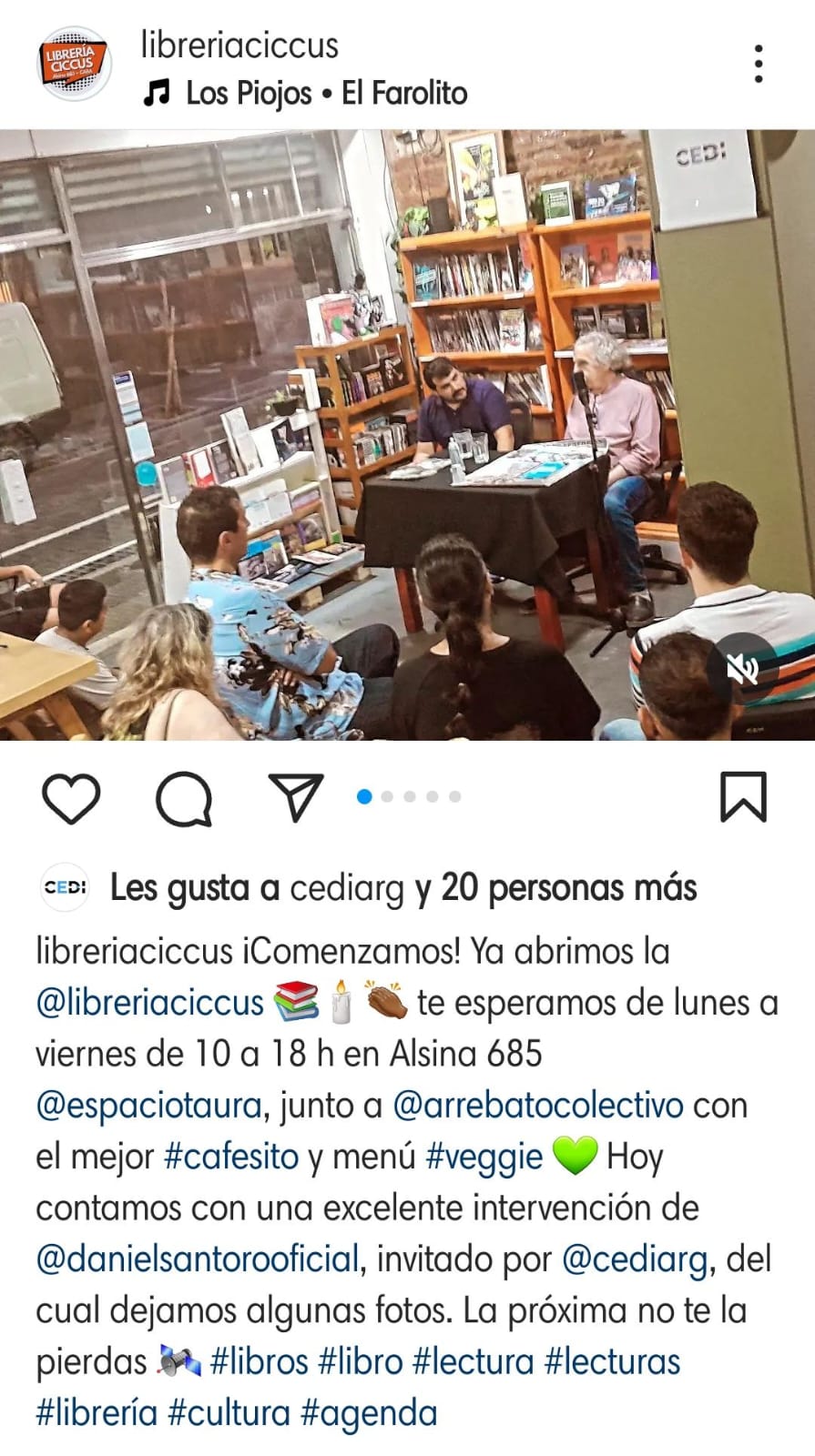 La Librería CICCUS abrió al público el pasado viernes 1 de marzo de 2024, en Espacio Taura, ubicado en Alsina 685, a pocas cuadras de Plaza de Mayo, en pleno microcentro. Ese día, visitó el lugar el artista Daniel Santoro, quien analizó el contexto social y político argentino desde el peronismo y la hora de la misericordia, invitado por el Centro de Estudios para el Desarrollo Integral (CEDI).