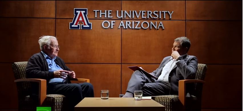 En el nuevo programa de RT en Español, «Conversando con Correa», emitido el 1 de marzo pasado, el ex-presidente de Ecuador Rafael Correa entrevista al filósofo y activista político norteamericano Noam Chomsky.