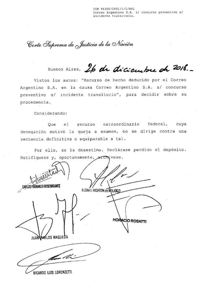 Los cinco integrantes de la Corte Suprema de Justicia firmaron el rechazo al recurso interpuesto por el abogado Jaime L. Kleidermacher, quien representa los intereses de la familia Macri en la causa por la deuda que el Correo Argentino mantiene con el Estado Nacional.