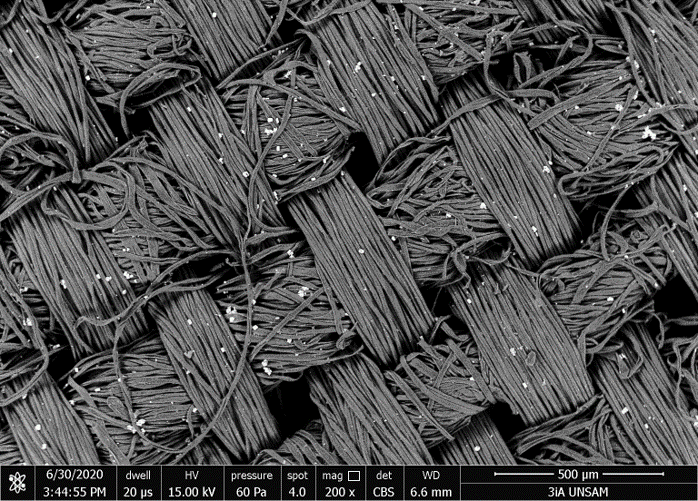 Sobre la caracterización del material producido, Candal explica: “Hicimos un análisis morfológico de las telas fabricadas con componentes industriales por microscopía electrónica de barrido, lo que nos permitió comprobar la regularidad en la aplicación de los activos. Para determinar la actividad antimicrobiana de la tela activa realizamos ensayos basados en normas internacionales”.