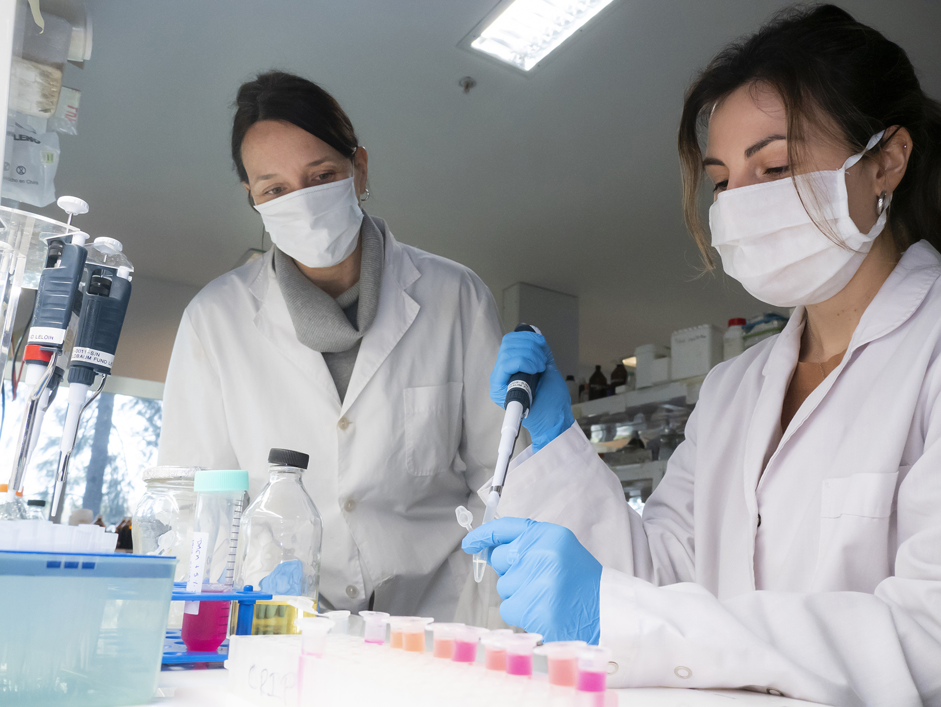 María Laura Cerutti y María Eugenia Acuña, investigadoras del Centro de Rediseño e Ingeniería de Proteínas del Instituto de Investigaciones Biotecnológicas de la UNSAM, integran el equipo que produce la proteína RBD