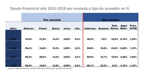 En el 2019, ya el 70% son bonos de ley internacional, los tenedores son internacionales y los ingresos fiscales son moneda local. La provincia se ha endeudado para afrontar gastos corrientes y no ha perfilado un imaginario de desarrollo diferente, ni ha mejorado las condiciones de vida de sus habitantes, y tiene por delante un delicado desequilibrio. Donde el tipo de cambio levite mínimamente, sus resultados serán devastadores.