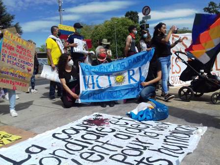 Horas antes, una parte de los convocantes había publicado el pronunciamiento “Paro Nacional Indefinido en Colombia: al borde una guerra civil”, firmado en tanto Ciudadano-as colombiano-as en el mundo. El mismo, constituye una convocatoria a la comunidad internacional –gobiernos, organizaciones de Derechos Humanos, Naciones Unidas- para que respalde y verifique el cumplimiento de las reivindicaciones y demandas que sostiene el pueblo colombiano en las calles desde el 28 de abril pasado.