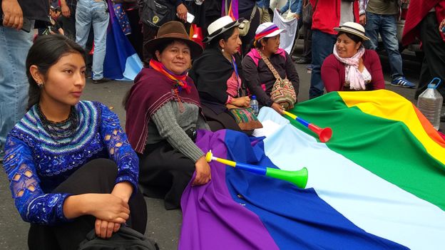 «La mujer indígena, hasta la actualidad, sufre una triple vulneración a sus derechos: por ser mujer, por ser indígena y por ser pobre. Las cifras oficiales muestran que la mujer indígena sigue siendo parte de ese nivel alto de pobreza. Igual es víctima de la violencia psicológica, sexual, física y cultural», explica a BBC News Mundo desde Quito, adonde ha marchado para protestar.