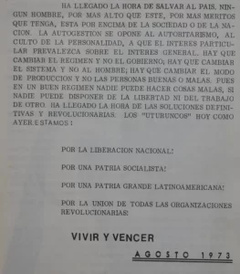 Asimismo, es un documento que se mueve al compás de diferentes temporalidades (reinterpreta el pasado y revisa el presente con vistas al futuro) pero manteniendo las concepciones que hizo de Uturuncos una auténtica guerrilla rural peronista: Los “Uturuncos” hoy como ayer estamos: por la liberación nacional!, por una patria socialista!, por una patria grande latinoamericana!, por la unión de todas las organizaciones revolucionarias! (Aporte para la Liberación Nacional, 1973).