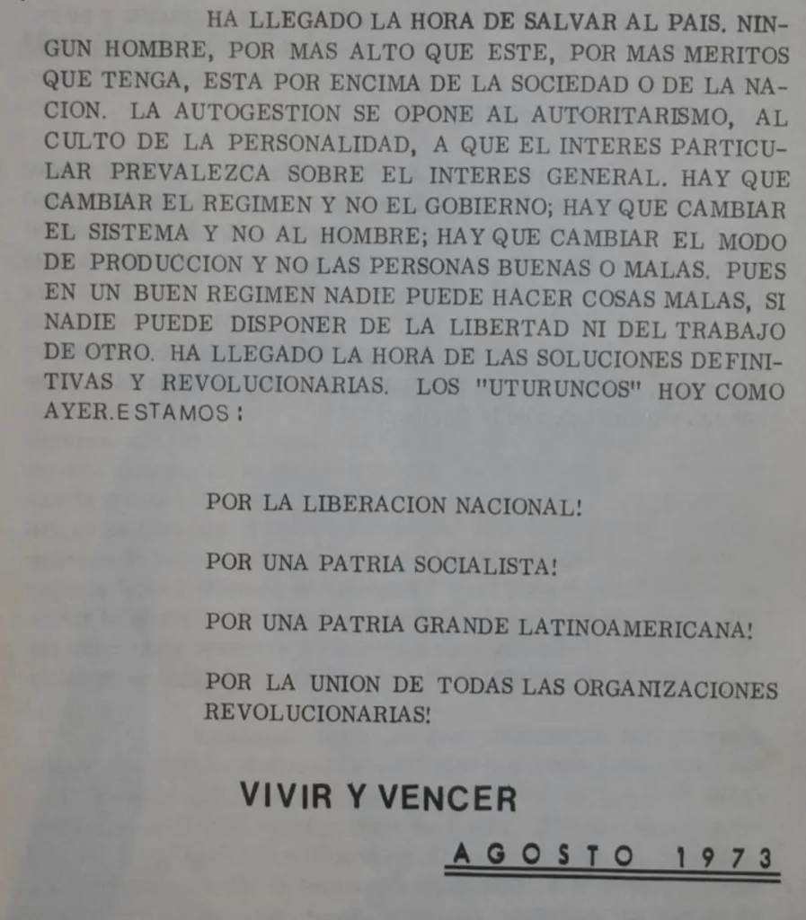 Asimismo, es un documento que se mueve al compás de diferentes temporalidades (reinterpreta el pasado y revisa el presente con vistas al futuro) pero manteniendo las concepciones que hizo de Uturuncos una auténtica guerrilla rural peronista: Los “Uturuncos” hoy como ayer estamos: por la liberación nacional!, por una patria socialista!, por una patria grande latinoamericana!, por la unión de todas las organizaciones revolucionarias! (Aporte para la Liberación Nacional, 1973).