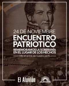 Como primera estación, tenemos el lunes 24 de noviembre. Junto a los compañeros de El Aluvión organizamos un gran encuentro militante en Obligado, para celebrar la gesta de la soberanía liderada por el Brigadier Juan Manuel de Rosas. En momentos de tanto saqueo e indignidad nacional, debemos recuperar la autoestima. ¡¿Qué mejor que recordar que fuimos el único país del mundo que venció a Inglaterra y a Francia juntas?! ¡Que lo hicimos para proteger la industria nacional y la soberanía de nuestros ríos interiores! Un encuentro entre compañeros de todo el país en la búsqueda de proyectar el gran sueño de la liberación nacional.