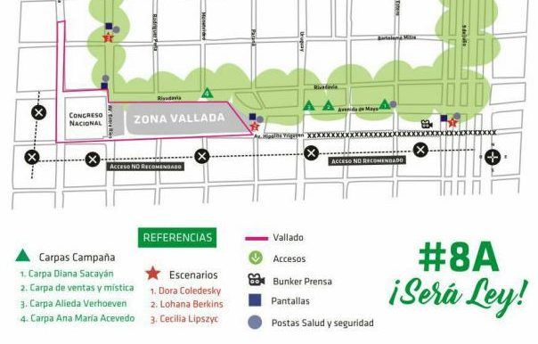 La Campaña Nacional por el Derecho al Aborto Legal, Seguro y Gratuito difundió el mapa con el sector que fue delimitado para la vigilia durante la sesión del 8 de agosto, cuando los senadores decidirán el destino del proyecto de interrupción voluntaria del embarazo y la continuidad o no de los abortos clandestinos.
