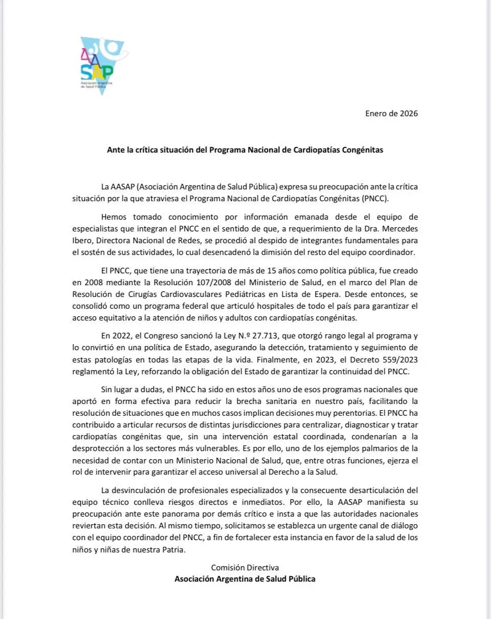 En cuanto se conoció la noticia, la Asociación Argentina de Salud Pública difundió un comunicado en el que manifiesta su preocupación e insta a las autoridades nacionales a revertir la decisión.