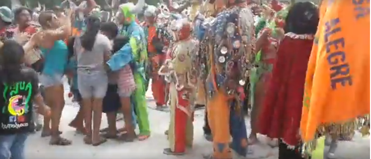 Nos unimos a una comparsa “Los Alegres” y entre danzas, risas y delirios de ebrios, me “fusilaron”: En pareja (aunque ya no era Damián, creo que para ese momento él ya había sido fusilado con Violeta), me senté frente a una mesa llena de diversas botellas de bebidas espirituosas, no sé, alrededor de doce quizá. Entonces nos empezaron a servir en pequeños vasitos un poco de cada una, y nosotros, los participantes, debíamos terminar a la vez cada chupito, sino multa, lo que implicaba una nueva medida de cualquiera de esos brebajes. Al finalizar, y como milagrosamente logramos ponernos de pie, nos hicieron miembro honorífico de dicha comparsa pintándonos en el rostro las siglas de la misma además de obsequiarnos un botón identificatorio para lucirlo en el pecho.