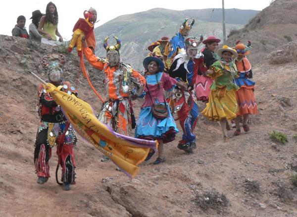 A la hora señalada nos dirigimos hacia el lugar, y después de comer hasta reventar una banda empezó a tocar y todos los presentes nos fuimos encolumnando detrás de ella siguiendo sus pasos hasta la calle. La gente danzaba al ritmo de los sikus, la caja, el erkencho y el charango, mientras nos encaminábamos hacia un lugar hasta ese momento desconocido por mí. Ibamos dejando el poblado para adentrarnos en los cerros multiformes.