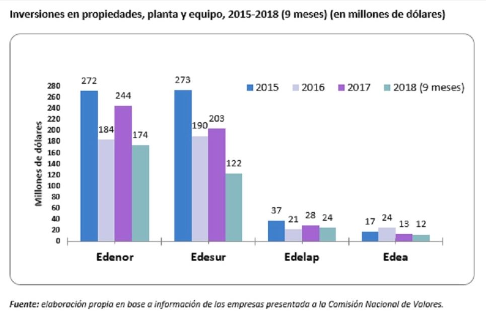 En este marco, y teniendo en cuenta las ingentes ganancias empresarias que garantiza la política tarifaria actual, resulta interesante detenerse en la evolución de las inversiones de las 4 empresas de distribución eléctrica más importantes del AMBA y la provincia de Buenos Aires. Si tomamos la inversión total en dólares en propiedades, planta y equiposrealizada entre 2015 y septiembre de 2018 por EDESUR, EDENOR, EDELAP y EDEA, observamos, en primer lugar, que el año 2015 se destaca, por lejos, como el año de mayor inversión para cada una de las empresas.