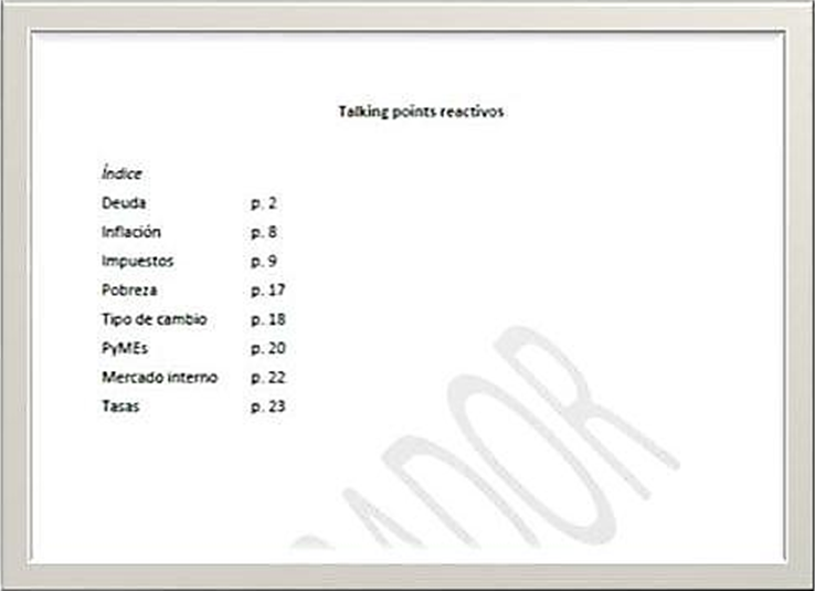 En este caso, los “points de Cambiemos”, pretenden apoyar a sus voceros más importantes, ante las críticas duras y argumentadas sobre los temas de Deuda, Inflación, Impuestos, Pobreza, Tipo de cambio, PyMEs, Mercado interno y Tasas, desarrollados en ese orden y a partir de frases que recuerdan aquel consejo de Jaime Durán Barba al ex titular del Banco Central, Federico Adolfo Sturzenegger, acerca de eludir la realidad o tergiversarla: “Solo di que están mintiendo con la inflación, o decí cualquier cosa, hablá de tus hijos». El documento se puede resumir diciendo que todos los problemas que enfrenta el gobierno que iba a lograr una “pobreza cero” se deben a que “el kirchnerismo dejó un país arruinado”, todo lo contrario a lo que se expresó cuando salió a buscar préstamos internacionales y presentó a la Argentina heredada como una “Tierra de Oportunidades”.