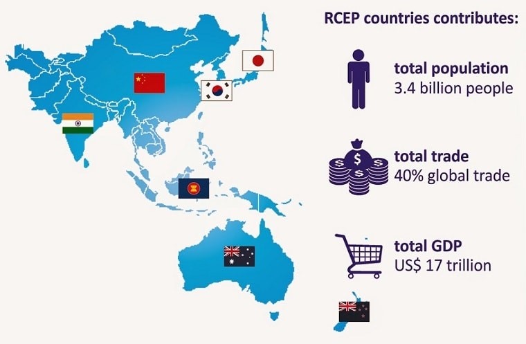 El acuerdo se construyó sobre la base de lo pactado en la ASEAN. Con China en 2004, Corea del Sur en 2006, Japón en 2007, y Australia y Nueva Zelanda en 2008. Incluso la ASEAN tiene un acuerdo comercial firmado con India, país que se salió de las negociaciones del RCEP en 2019. Un mercado del 44% de la población mundial, el 32% del PBI del planeta y una clase media creciente por encima de mil millones de personas supera a la Unión Europea y el Tratado de México, Estados Unidos y Canadá. Con la idea establecidad en sus 54 cronogramas de compromisos, se desgravarán eventualmente aranceles en más del 90% de los bienes comerciados entre los países en un plazo aproximado de 20 años, lo que, a su vez, impulsará más el comercio y los flujos de inversión hacia y dentro de la región, potenciándose así la importancia de los países del este asiático en la cadenas globales de valor.