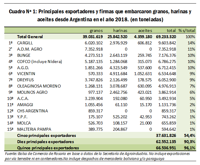 Las diez principales empresas exportadoras de granos y subproductos fueron responsables del 93% de los embarques argentinos al exterior durante el 2018, según la Bolsa de Comercio de Rosario. Cinco de ellas exportaron el 54% de un total de 69 millones de toneladas de granos, harinas y aceites producidos el país el año pasado, como muestra el cuadro más adelante.
