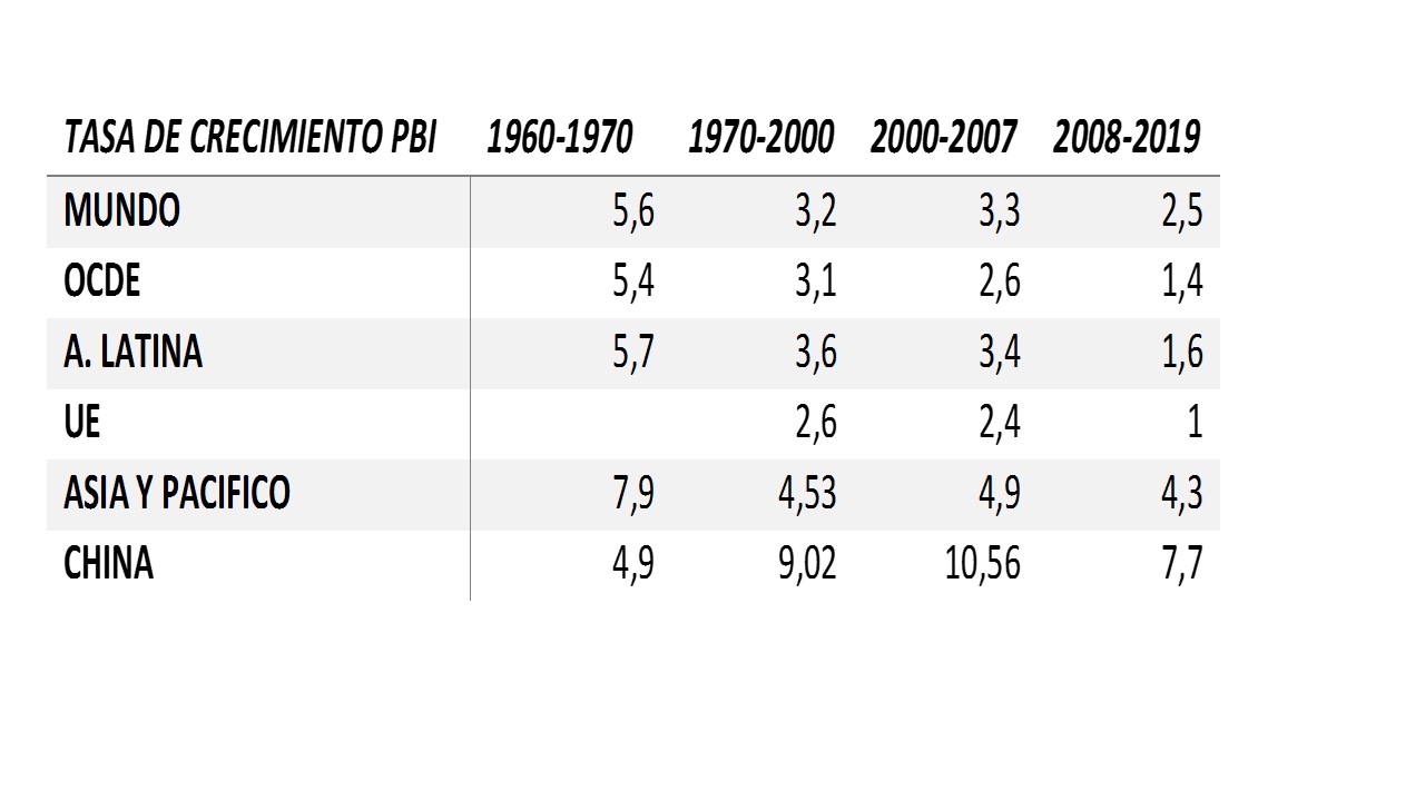 Como muestra en cuadro, el mundo previo a la pandemia venía con una tasa de crecimiento del producto aceptable, hasta el afianzamiento del neoliberalismo, que lo redujo a la mitad. América Latina creció a una tasa razonable de 1970 a 2000, incluso con la década perdida jugando en su contra, al soportar la carga de un magro crecimiento del 1.2%.