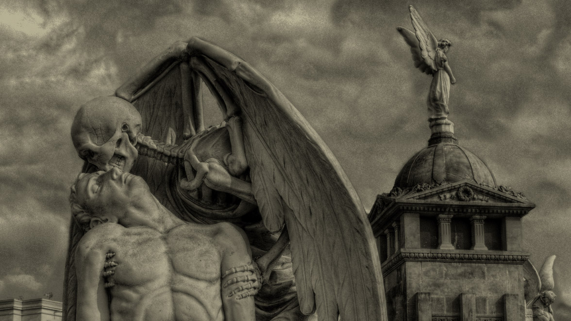 La imagen de portada corresponde a El Beso de la Muerte, una escultura de mármol que se encuentra en el cementerio de Poblenou en Barcelona.