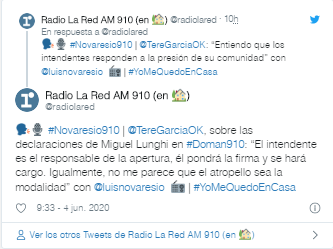 «Los intendentes de Bahía Blanca, Olavarría, Campana, Vicente López y Tandil hicieron ayer un planteo de abrir si o sí. La provincia tiene determinaciones que responden al decreto nacional. Hay cosas, como la actividad deportiva, que no se pueden hacer. En el interior están habilitadas las cuestiones recreativas como las caminatas», graficó García en declaraciones radiales.