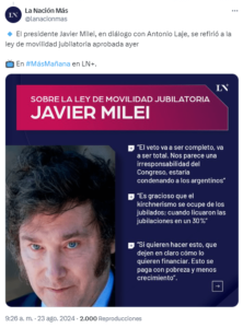 El Presidente Milei sostuvo el viernes en una entrevista para LN+ con Antonio Laje que los legisladores debían aclarar de dónde saldrían los fondos para financiar la medida.