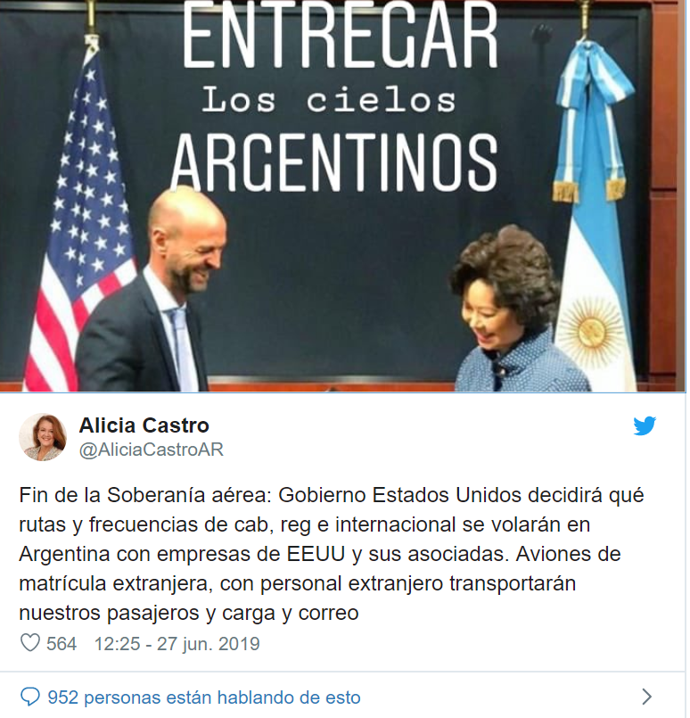 Tras conocerse la infame noticia, Alicia Castro, ex titular del Sindicato de Aeronavegantes, descargó su bronca en su cuenta de Twitter.