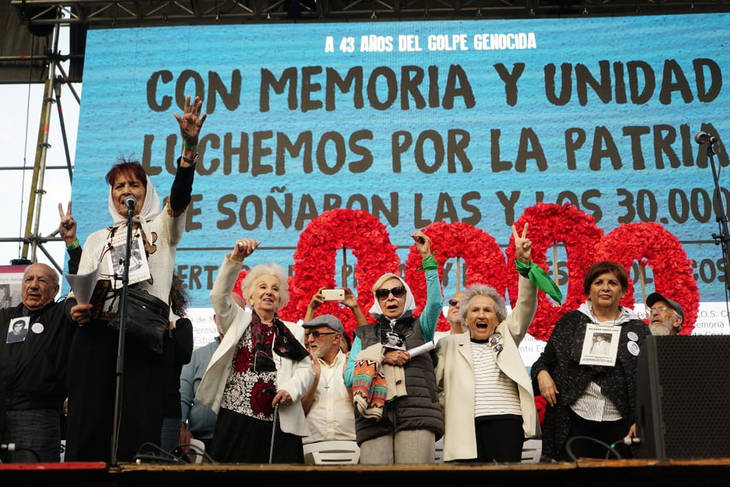 -A 43 años del golpe genocida, en esta Plaza de Mayo, reafirmamos nuestra reivindicación a los 30.000 detenidos-desaparecidos y seguimos luchando por la Patria con la que soñaron. Este año tenemos nuevamente un compromiso con la democracia para elegir representantes para los próximos cuatro años. La memoria y la unidad son las herramientas para recuperar nuestros derechos, porque sabemos que cuando el pueblo construye su historia nada puede detenerlo.