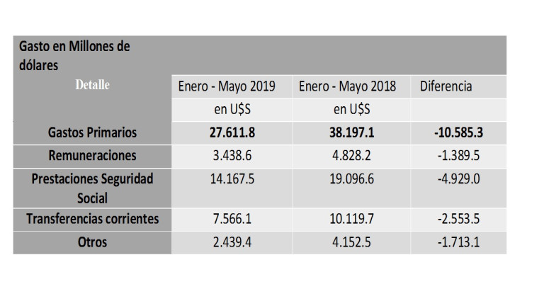 Con estos niveles de recaudación comienza a sonar sorprendente la propaganda gubernamental de haber logrado un superávit primario de 1.081.3% respecto al mismo periodo del año anterior. En el 2018 el superávit primario alcanzó los U$S 447 millones y este año llegó a los U$S 2.900 millones; más descabellado aún, si sabemos que los intereses de la deuda se dispararon por encima de un 132.9% en mayo de este año. La pequeña trampa que hay aquí es que los ingresos menos los gastos dan el resultado primario, antes del pago de intereses. Así que, si los ingresos cayeron en forma alarmante, para lograr un superávit los gastos se tiene que haber derrumbado de forma mucho más pronunciada que los primeros. Veamos esto.
