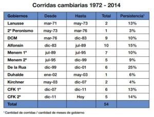 Desde 1972 se calcula que Argentina atravesó 54 corridas cambiarias. Una corrida cambiaria se define a partir una cierta caída de las reservas internacionales y/o en movimientos del tipo de cambio. Durante las últimas cuatro décadas, coincidentes con el paradigma de valorización financiera instaurado por la última dictadura cívico-militar, Argentina sufrió corridas cambiarias recurrentes, que se interrumpieron temporalmente durante gran parte de la convertibilidad y la presidencia de Néstor Kirchner.