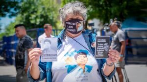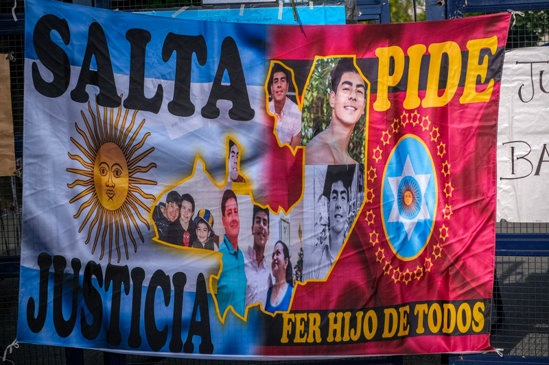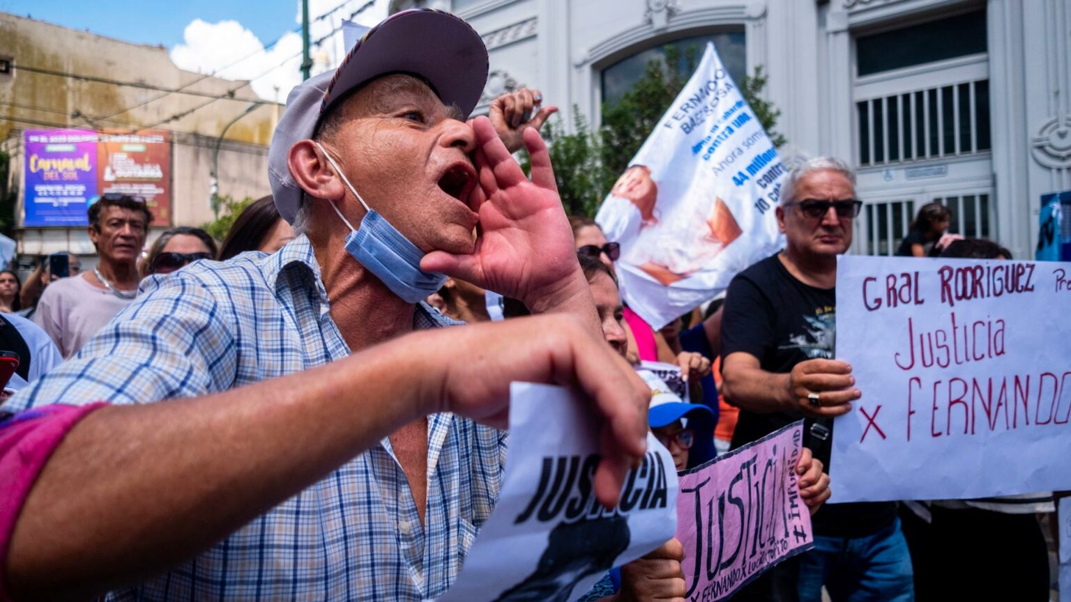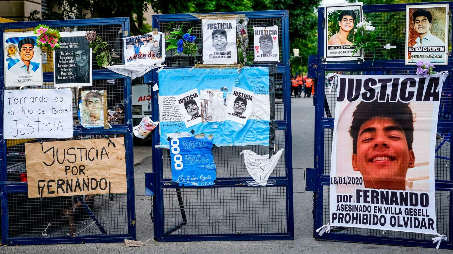 Cada mañana, desde muy temprano, la mujer pegaba muchos de los carteles que luego aparecían en la televisión. Se apostaba casi todo el día en la puerta del juzgado y se quedaba vigilando hasta tarde que las banderas estuvieran en orden y los letreros no se despegaran. Lucía el kit completo de apoyo a la familia del joven asesinado el 18 de enero de 2020: en la mano derecha una bandera con la cara de Fernando; en la izquierda, una pancarta pidiendo justicia con la cara de Fernando; colgado de la oreja, un barbijo que —también— tenía la imagen del joven y —también— exigía “perpetua para sus asesinos”; una remera con su cara dibujada sobre una bandera argentina y un prendedor que —no era difícil imaginarlo— también mostraba su rostro.