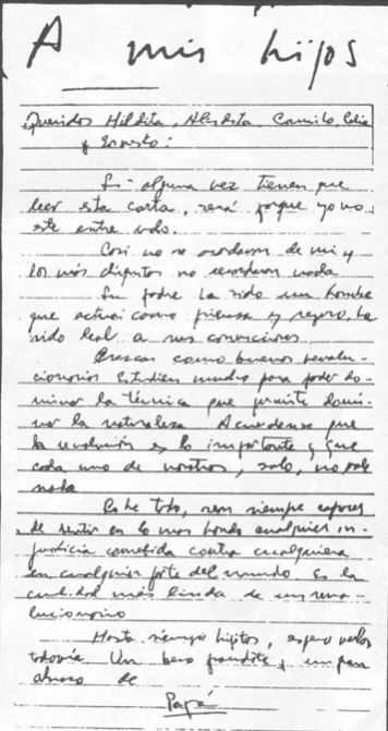 Transcribe la carta de despedida que le escribió el Che a sus hijes Hildita, Aleidita, Camilo, Celia y Ernesto en marzo de 1965, en la que da cuenta de su profundo amor de padre y su compromiso militante: “Si alguna vez tienen que leer esta carta será porque yo no esté entre ustedes. Casi no se acordarán de mí y los más chiquitos no recordarán nada”. Les explica que “ha sido un hombre que actúa como piensa y, seguro, ha sido leal a sus convicciones”. Les pide que “crezcan como buenos revolucionarios, que estudien mucho para dominar la técnica que permite dominar la naturaleza” y sentencia que “la revolución es lo importante y que cada uno de nosotros, solo, no vale nada”, una frase que bien podría haber sido tomada de la reflexión del propio Oesterheld.