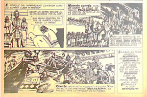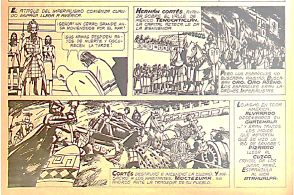 Oesterheld denuncia al Imperio español por el robo del oro y la plata, por las condiciones inhumanas que impuso en las minas de estos minerales, en las que los indios llegaban a preferir la muerte antes que ir a trabajar en condiciones criminales. Además, el imperialismo implicó guerras de dominación que vaciaron al continente de hombres y mujeres: cuando España llegó a América había 90 millones de indios, dos siglos después quedaban solo 3 millones… Casi 90 millones de muertos más que en las dos guerras mundiales (págs.7 y 8).