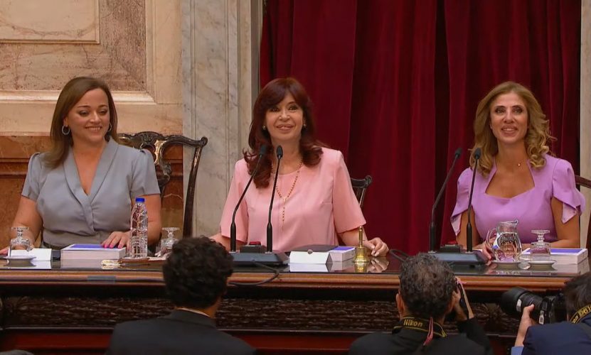 La vicepresidenta Cristina Fernández de Kirchner destacó estar acompañada por otras dos mujeres, la presidenta de la Cámara de Diputados, Cecilia Moreau, y la presidenta provisional del Senado, Claudia Ledesma Abdala.