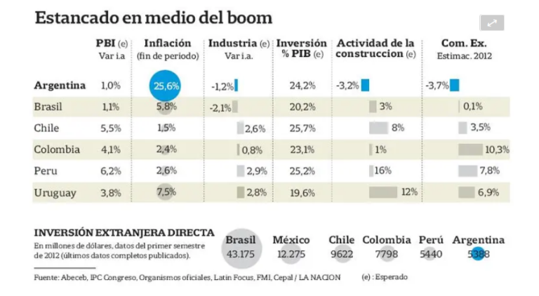 Todos los indicadores que veremos a continuación para la Argentina son de una magnitud infrecuente. Lo extraño, como dijimos, es el abordaje de los medios y, por ende, la mirada de los habitantes respecto a ellos. El cuadro siguiente muestra una publicación del diario La Nación para febrero del 2013, con datos del año 2012, y su título era La Argentina tuvo en 2012 los peores indicadores de la región.