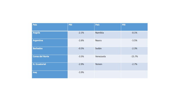 De ellos, tres están en guerra, Sudán, Yemen y Namibia en una no declarada. Cuatro de ellos, Iraq, Corea del Norte, Venezuela y Angola, son países aislados, o saliendo de años de conflicto (27 años de guerra civil en Angola, invasión en el caso de Iraq, etc.). La Republica de Nauru, el tercer país más chico de la Tierra, con 13.625 habitantes, no deja mucho margen al crecimiento que no sea mediante el turismo o a través del horroroso centro de internamiento para inmigrantes, gestor de los mayores problemas mentales del país. Los tres restantes son una isla, Bermudas, un país centroafricano plagado de conflictos a su alrededor, Guinea Ecuatorial, y Argentina, sin explicación aparente a su caída.