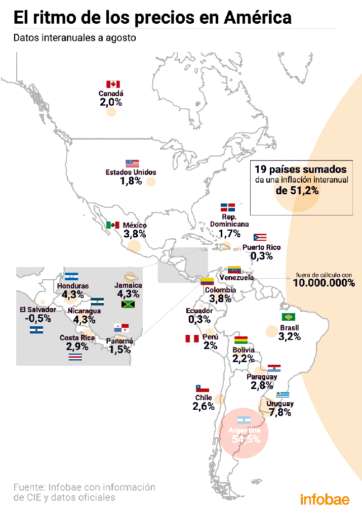 Nuevamente, la inflación expuesta como anormal en el artículo de La Nación para el año 2012, del 25,6%, se perdió en la nebulosa del tiempo. Hoy Argentina tiene una inflación de 54.5%, que no solo es la más alta de Latinoamérica sino, como bien marca el gráfico, la suma de todos los índices de inflación de 19 países del continente americano es inferior a la argentina.