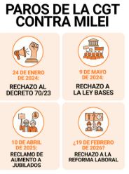 Infografía que detalla los paros realizados por la CGT contra el gobierno de Milei, especificando fechas y motivos de cada protesta.