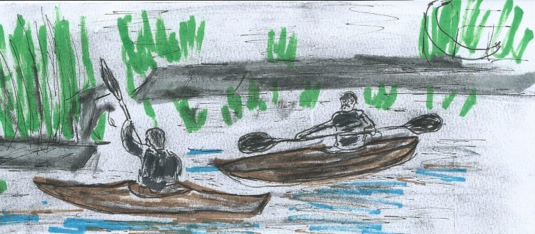 Se detuvieron donde los yuyos parecían más altos. Tomaron un kayak, cada uno de un extremo y lo dieron vuelta, panza arriba. Repitieron la operación con el otro. Entre los dos, tan ocultas como era posible, dejaron las bolsas estancas con los trajes, los chalecos y las palas desarmadas. Se cambiaron sin perder un instante.