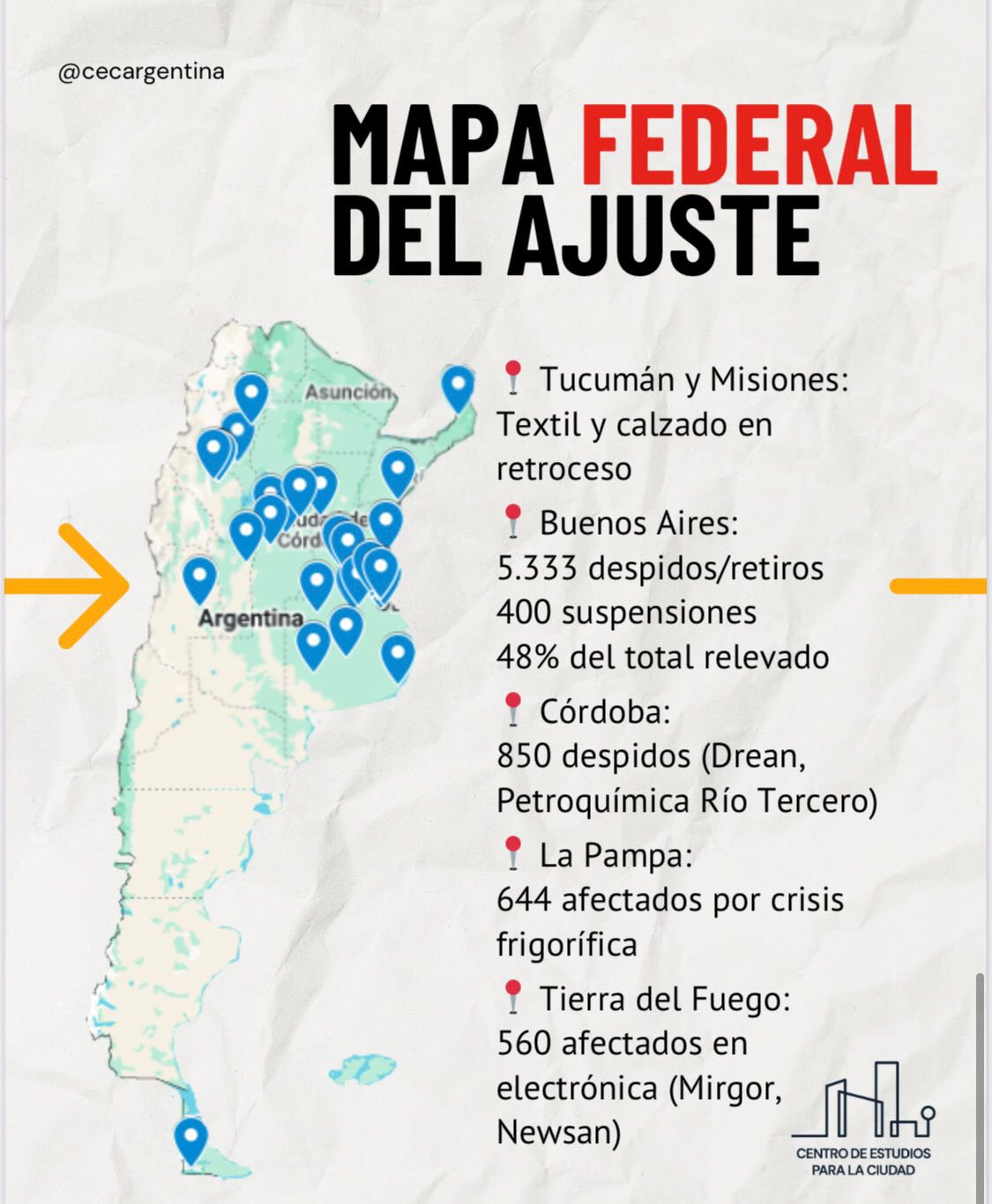 Un mapa desarrollado por el Centro de Estudios para la Ciudad releva despidos y suspensiones de trabajadores que se anunciaron este año en grandes empresas. La herramienta permite analizar las ramas más afectadas de la industria y los lugares del país en los que la situación laboral es más compleja, donde la matriz productiva se destruye y se pierden trabajos de calidad.