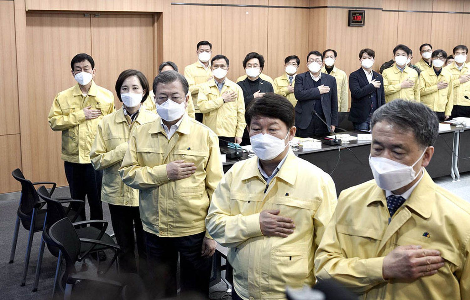 El presidente de Corea del sur, el tercero por la izquierda, el pasado 25 de febrero en el Ayuntamiento de Daegu.SOUTH KOREAN PRESIDENTIAL BLUE HOUSE/GETTY IMAGES / SOUTH KOREAN PRESIDENTIAL BLUE H