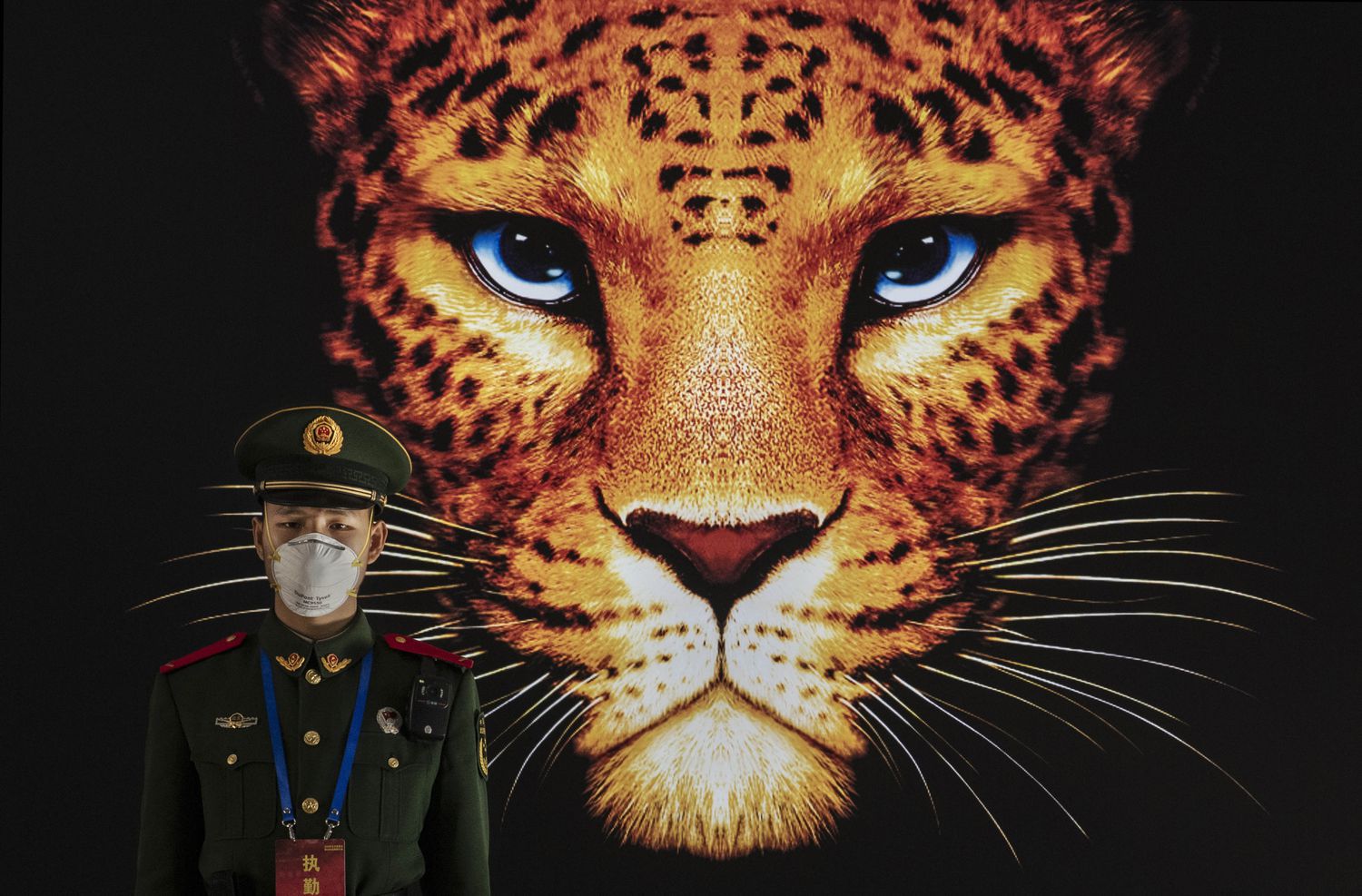 Un oficial de policía vigila ante un cartel el pasado 23 de enero en Pekín.